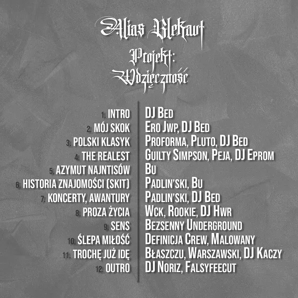 Alias Blekaut promocję albumu „Projekt: Wdzięczność” rozpoczął przed miesiącem singlem „Mój Skok” z gościnnym udziałem Ero JWP. Wówczas też przybliżyliśmy Wam zarys producenckiej płyty Blekauta. Dzisiaj natomiast możemy już zdradzić Wam wspomnianych, a wtedy jeszcze skrywanych w tajemnicy, gości zaproszonych przez beatmakera z Chrzanowa na „Projekt: Wdzięczność”. A jest, co najmniej, nietuzinkowo. Oprócz wspomnianego Erosa, na albumie uświadczymy numer, który wspólnie nagrali Peja, DJ Eprom i pochodzący z Detroit Guilty Simpson. Track składu WCK czy też kawałki nagrane przez Bu, Padlin’skiego, Bezsenny Underground, Definicja Crew,, Błaszczu i Warszawskiego. A jako, że „Projekt: Wdzięczność” zapowiadany jest jako płyta utrzymana w klimacie klasycznie brzmiącego rapu, pojawić musieli się i DJ-e. W tym przypadku są to DJ Bed, przywołany już Eprom, a także DJ HWR, DJ Kaczy, Malowany, DJ Noriz i Falsyfeecut. Pełną tracklistę płyty „Projekt: Wdzięczność” znajdziecie poniżej.
