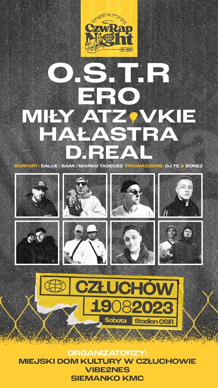 Po pierwszych ogłoszonych artystach na CZW RAP NIGHT 2023 przyszła kolej na kolejnych. Do tegorocznego składu dołączają, m.in. legendarny raper O.S.T.R., wszechstronny Miły ATZ oraz jako support Dalue i duet Sami/Marko Tadeusz. Zapowiedziano również jam deskorolkowy, na który możecie zapisać się również i Wy!