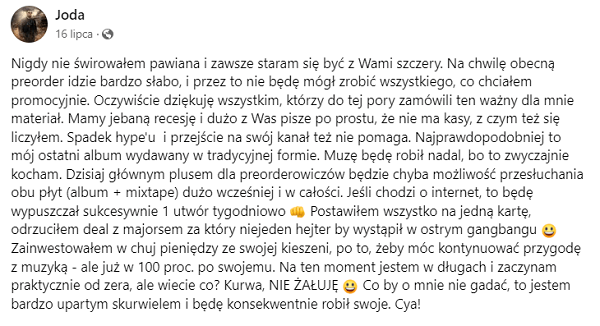 Jeśli Joda rzeczywiście wypisał się już z udziału w beefie, całość możemy uznać za zakończoną. Każdy może samodzielnie przesłuchać nagrane dissy, prześledzić social media i samodzielnie wyciągnąć wnioski odnośnie sensowności całej afery. Dla nas wygląda to jak szukanie rozgłosu przez ADM’a. Chyba że jakiś poważniejszy powód kryje się pod wersami zahaczającymi o świat youtube’erów, którego jednak z szacunku do własnej godności nie śledzimy i śledzić nie zamierzamy.