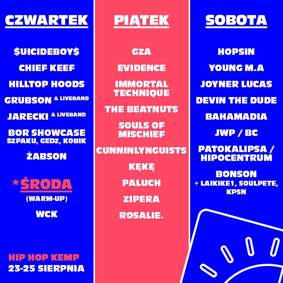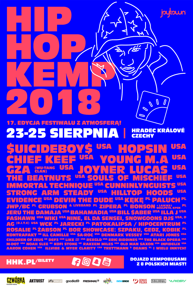 A jak wiemy już kto zagra, z miejsca nasuwa się pytanie: kiedy? To, że w terminie od 23-25 sierpnia w czeskim Hradec Kralove wiedzą od dawna wszyscy wybierający się w tym roku na Hip Hop Kemp. Teraz natomiast przyszła pora by precyzyjnie przedstawić Wam, który z headlinerów HHK 2018 zagra w czwartek, kto wystąpi w piątek, a na kogo show bawić będziemy się w sobotę. A headlinerów na tegorocznym Kempie trochę jest. Wystarczy wspomnieć Hopsina, Geniusa z legendarnego Wu-Tang Clanu, $uicideboy$, Young M.A., Devina The Dude, The Beatnuts, Hilltop Hoods, Souls of Mischief i wielu, wielu, wielu innych. A jako stali bywalcy Hip Hop Kempu, i tak doskonale zdajemy sobie sprawę, że pojęcie gwiazdy głównej na tym festiwalu jest bardzo subiektywne. Przejdźmy więc do rzeczy! Rozpiska dniowa Hip Hop Kemp 2018 na moment bieżący prezentuje się następująco: