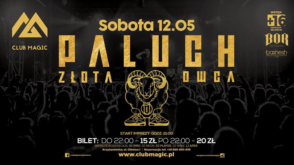 Agencja Bashesh oraz Club Magic mają zaszczyt zaprosić na koncert Palucha, który odbędzie się 12 maja 2018 w Krzyżanowicach. Koncert promuje album „Złota Owca”.