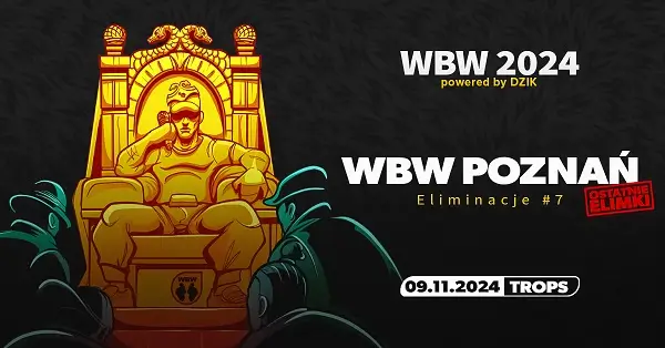 Siódma, ostatnia bitwa eliminacyjna do WBW 2024 odbędzie się 9 listopada w poznańskim klubie TROPS. Poprowadzi ją Murzyn, a w loży jurorskiej zasiądą Mikser, Dolar oraz Bonez. Za deckami stanie DJ Avens. Bilet na wydarzenie kupisz TU.