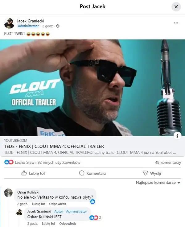 „FENIX”, którego TEDE puścił również w serwisach streamingowych, nie promuje jednak jedynie CLOUT MMA 4. Zaprezentowany w dniu dzisiejszym singiel jest zarówno zwiastunem albumu „VOX VERITATIS”, co z kolei potwierdza sam TDF. Czekamy zatem na nadchodzący 'głos prawdy’.